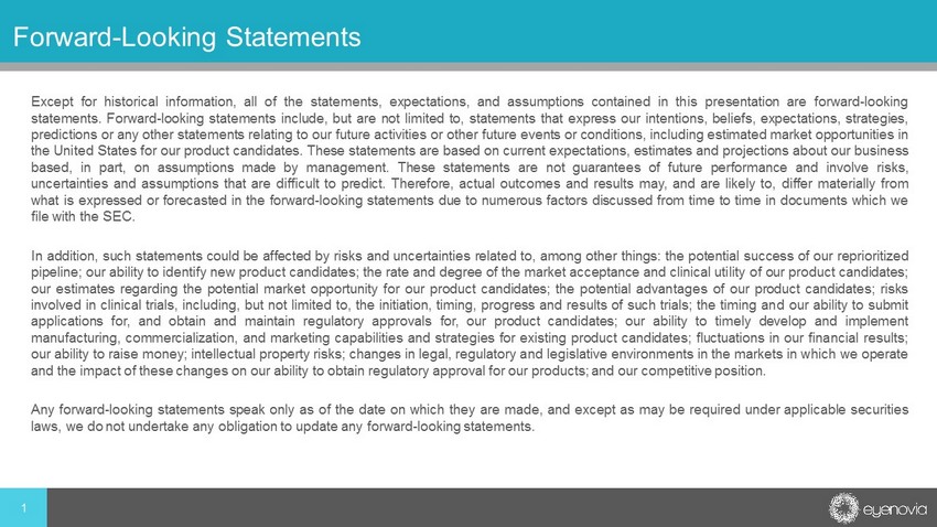 Except for historical information, all of the statements, expectations, and assumptions contained in this presentation are forward - looking statements . Forward - looking statements include, but are not limited to, statements that express our intentions, beliefs, expectations, strategies, predictions or any other statements relating to our future activities or other future events or conditions, including estimated market opportunities in the United States for our product candidates . These statements are based on current expectations, estimates and projections about our business based, in part, on assumptions made by management . These statements are not guarantees of future performance and involve risks, uncertainties and assumptions that are difficult to predict . Therefore, actual outcomes and results may, and are likely to, differ materially from what is expressed or forecasted in the forward - looking statements due to numerous factors discussed from time to time in documents which we file with the SEC . In addition, such statements could be affected by risks and uncertainties related to, among other things : the potential success of our reprioritized pipeline ; our ability to identify new product candidates ; the rate and degree of the market acceptance and clinical utility of our product candidates ; our estimates regarding the potential market opportunity for our product candidates ; the potential advantages of our product candidates ; risks involved in clinical trials, including, but not limited to, the initiation, timing, progress and results of such trials ; the timing and our ability to submit applications for, and obtain and maintain regulatory approvals for, our product candidates ; our ability to timely develop and implement manufacturing, commercialization, and marketing capabilities and strategies for existing product candidates ; fluctuations in our financial results ; our ability to raise money ; intellectual property risks ; changes in legal, regulatory and legislative environments in the markets in which we operate and the impact of these changes on our ability to obtain regulatory approval for our products ; and our competitive position . Any forward - looking statements speak only as of the date on which they are made, and except as may be required under applicable securities laws, we do not undertake any obligation to update any forward - looking statements . 1 Forward - Looking Statements