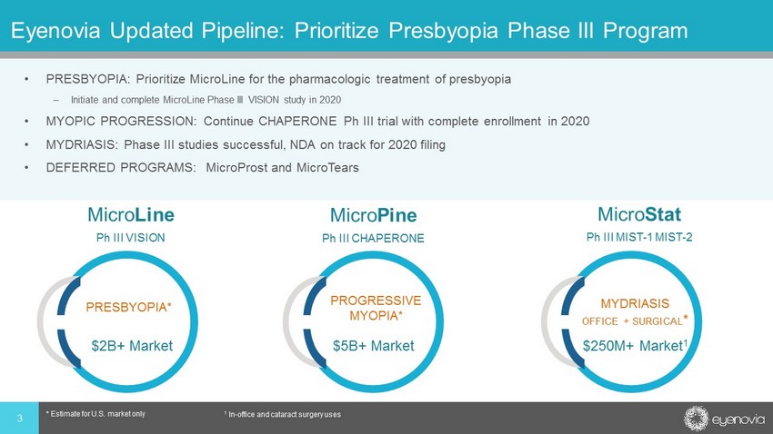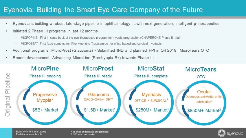 Eyenovia Updated Pipeline: Prioritize Presbyopia Phase III Program • PRESBYOPIA: Prioritize MicroLine for the pharmacologic treatment of presbyopia – Initiate and complete MicroLine Phase III VISION study in 2020 • MYOPIC PROGRESSION: Continue CHAPERONE Ph III trial with complete enrollment in 2020 • MYDRIASIS: Phase III studies successful, NDA on track for 2020 filing • DEFERRED PROGRAMS: MicroProst and MicroTears 3 * Estimate for U.S. market only 1 In - office and cataract surgery uses PRESBYOPIA* MYDRIASIS OFFICE + SURGICAL * $2B+ Market $250M+ Market 1 Micro Line Ph III VISION Micro Stat Ph III MIST - 1 MIST - 2 Micro Pine Ph III CHAPERONE PROGRESSIVE MYOPIA* $5B+ Market