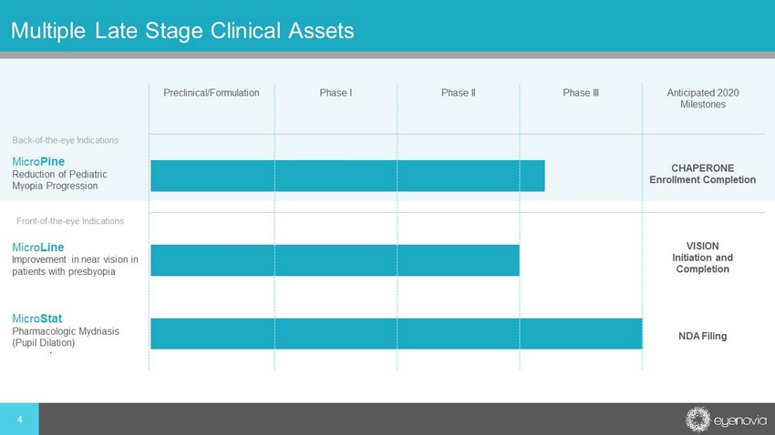 Eyenovia: Building the Smart Eye Care Company of the Future • Eyenovia is building a robust late - stage pipeline in ophthalmology …with next generation, intelligent µ - therapeutics • Initiated 2 Phase III programs in last 12 months – MICROPINE: First - in class back - of - the - eye therapeutic program for myopic progression (CHAPERONE Phase III trial) – MICROSTAT: First fixed combination Phenylephrine - Tropicamide for office - based and surgical mydriasis • Additional programs: MicroProst (Glaucoma) - Submitted IND and planned FPI in Q4 2019 | MicroTears OTC • Recent development: Advancing MicroLine (Presbyopia Rx) towards Phase III 2 * Estimate for U.S. market only 1 First - line treatments only 2 In - office and cataract surgery uses 3 OTC eye care market Micro Pine Phase III ongoing Micro Prost Phase III ready Micro Stat Phase III complete Micro Tears OTC Progressive Myopia* Glaucoma CACG+OAG+ OHT* Mydriasis OFFICE + SURGICAL * $5B+ Market $1.5B+ Market 1 $250M+ Market 2 Ocular Decongestant/Antipruritic/ Lubrication* $850M+ Market 3 Original Pipeline