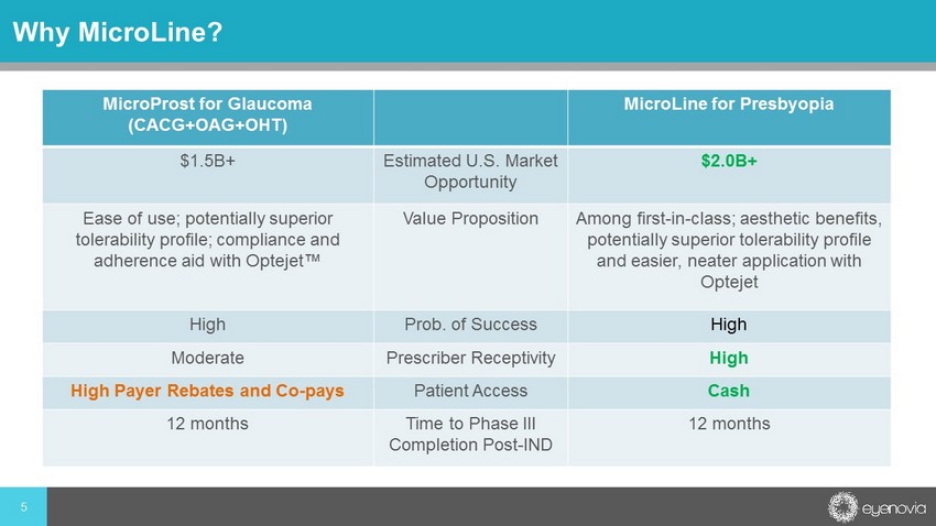 4 Multiple Late Stage Clinical Assets Back - of - the - eye Indications Front - of - the - eye Indications Preclinical/Formulation Phase I Phase II Phase III Anticipated 2020 Milestones Micro Pine Reduction of Pediatric Myopia Progression CHAPERONE Enrollment Completion Micro Line Improvement in near vision in patients with presbyopia VISION Initiation and Completion Micro Stat Pharmacologic Mydriasis (Pupil Dilation) NDA Filing