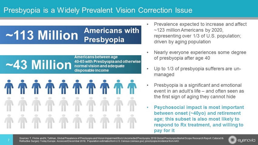 Etiology • Non - preventable, age - related hardening of the lens Symptoms • Tendency to hold reading material farther away to make the letters clearer • Blurred vision at normal reading distance • Eye strain , headaches after reading or doing close - up work Risk Factors • Age • Medical conditions and co - morbidities such as cardiovascular conditions, Multiple sclerosis, Type 2 diabetes can increase risk of premature presbyopia • Drugs associated with premature symptoms: antidepressants, anti - histamines, diuretics Diagnosis • Basic eye exam, with refraction assessment 6 Presbyopia: the Progressive Loss of Ability to Focus on Nearby Objects Sources: Mayo Clinic Presbyopia Overview. Wollfsohn et al. Prog Retin Eye Res. Fernandez et al. J Ophthalm . Accessed December 2018