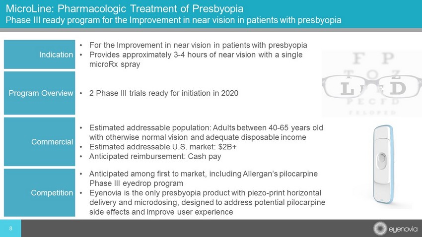 • Prevalence expected to increase and affect ~123 million Americans by 2020, representing over 1/3 of U.S. population; driven by aging population • Nearly everyone experiences some degree of presbyopia after age 40 • Up to 1/3 of presbyopia sufferers are un - managed • Presbyopia is a significant and emotional event in an adult’s life – and often seen as the first sign of aging they cannot hide • Psychosocial impact is most important between onset (~40yo) and retirement age; this subset is also most likely to respond to Rx treatment, and willing to pay for it 7 Presbyopia is a Widely Prevalent Vision Correction Issue Sources: T, Fricke and N, Tahhan , Global Prevalence of Presbyopia and Vision Impairment from Uncorrected Presbyopia. 2018 Global Presbyopia Market Scope Rese arc h Report. Cataract & Refractive Surgery Today Europe. Accessed December 2018. Population estimates from U.S. Census (census.gov); presbyopia inci den ce from AAO. ~43 Million Americans between age 40 - 65 with Presbyopia and otherwise normal vision and adequate disposable income ~113 Million Americans with Presbyopia