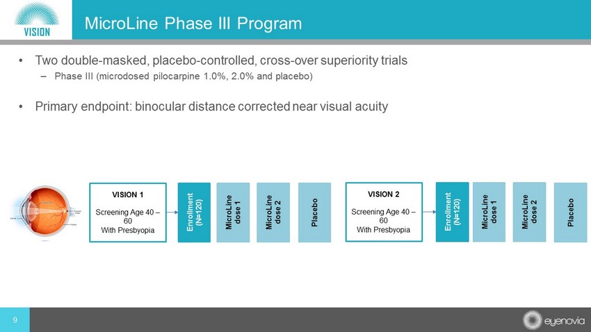 Indication • For the Improvement in near vision in patients with presbyopia • Provides approximately 3 - 4 hours of near vision with a single microRx spray Program Overview • 2 Phase III trials ready for initiation in 2020 Commercial • Estimated addressable population: Adults between 40 - 65 years old with otherwise normal vision and adequate disposable income • Estimated addressable U.S. market: $2B+ • Anticipated reimbursement: Cash pay Competition • Anticipated among first to market, including Allergan’s pilocarpine Phase III eyedrop program • Eyenovia is the only presbyopia product with piezo - print horizontal delivery and microdosing , designed to address potential pilocarpine side effects and improve user experience 8 MicroLine : Pharmacologic Treatment of Presbyopia Phase III ready program for the Improvement in near vision in patients with presbyopia