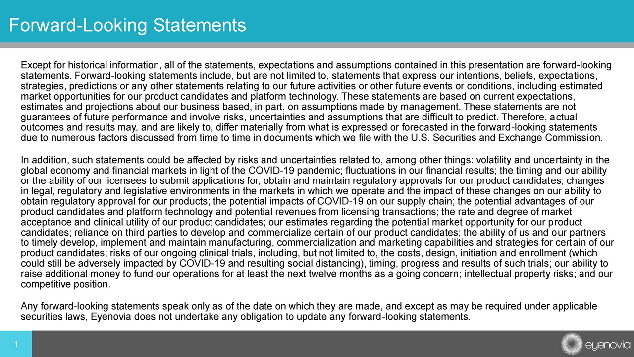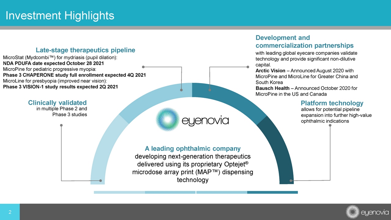 Except for historical information, all of the statements, expectations and assumptions contained in this presentation are for war d - looking statements. Forward - looking statements include, but are not limited to, statements that express our intentions, beliefs, expecta tions, strategies, predictions or any other statements relating to our future activities or other future events or conditions, inclu din g estimated market opportunities for our product candidates and platform technology. These statements are based on current expectations, estimates and projections about our business based, in part, on assumptions made by management. These statements are not guarantees of future performance and involve risks, uncertainties and assumptions that are difficult to predict. Therefore, a ctu al outcomes and results may, and are likely to, differ materially from what is expressed or forecasted in the forward - looking state ments due to numerous factors discussed from time to time in documents which we file with the U.S. Securities and Exchange Commissi on. In addition, such statements could be affected by risks and uncertainties related to, among other things: volatility and unce rta inty in the global economy and financial markets in light of the COVID - 19 pandemic; fluctuations in our financial results; the timing and our ability or the ability of our licensees to submit applications for, obtain and maintain regulatory approvals for our product candidat es; changes in legal, regulatory and legislative environments in the markets in which we operate and the impact of these changes on our a bil ity to obtain regulatory approval for our products; the potential impacts of COVID - 19 on our supply chain; the potential advantages of our product candidates and platform technology and potential revenues from licensing transactions; the rate and degree of market acceptance and clinical utility of our product candidates; our estimates regarding the potential market opportunity for our p rod uct candidates; reliance on third parties to develop and commercialize certain of our product candidates; the ability of us and o ur partners to timely develop, implement and maintain manufacturing, commercialization and marketing capabilities and strategies for cert ain of our product candidates; risks of our ongoing clinical trials, including, but not limited to, the costs, design, initiation and en rol lment (which could still be adversely impacted by COVID - 19 and resulting social distancing), timing, progress and results of such trials; our ability to raise additional money to fund our operations for at least the next twelve months as a going concern ; intellectual property risks; and our competitive position. Any forward - looking statements speak only as of the date on which they are made, and except as may be required under applicable securities laws, Eyenovia does not undertake any obligation to update any forward - looking statements. 1 Forward - Looking Statements