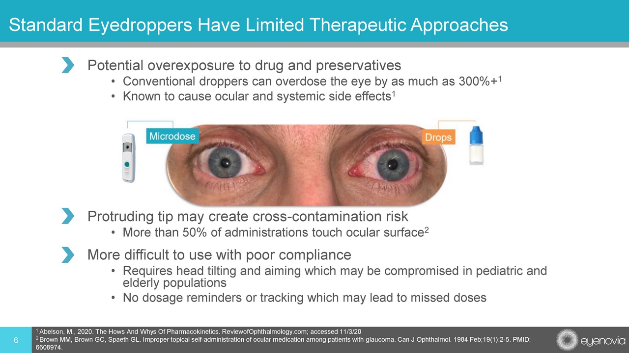 5 Potential Topical US Ophthalmic Market For Platform Technology* Lifestyle Enhancement Glaucoma: ~$3 Billion 3 Prescription Dry Eye: ~$1.6 Billion 2 Anti - Inflammatories: ~$1.4 Billion 1 Reduce IOP spikes due to high doses of steroids. Anti - Infectives: ~$650 Million 1 Eliminate contamination from poor usage of eyedropper bottles. *All potential market opportunities are estimates only 4 Estimate from Delveinsight Presbyopia Report, December 2020 1 IMS, 2015 2 Mixture of public information, IQVIA , Market Scope and estimates – Feb 2020 3 IQVIA, 2019 Improve systemic safety profile and allow for development of PGA + BB fixed combinations. Improvement in topical (e.g., hyperemia) and systemic AE profile. Multi - dose preservative free options. Improve clinical probability of success. Enable patients, especially the elderly, to better instill medication for improved results. Multi - dose preservative free options. Current Portfolio: ~$12.9 Billion* Existing Eyenovia portfolio in mydriasis, presbyopia, and myopia, with late - stage, first - in - class therapeutics. $0.0 $1.0 $2.0 $3.0 $4.0 $5.0 $6.0 $7.0 $8.0 Market Size Estimates for the United States (in US$ Billions)