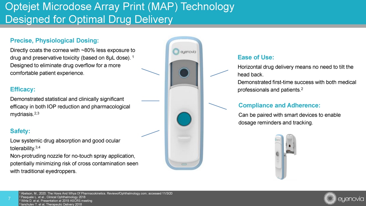 Potential overexposure to drug and preservatives • Conventional droppers can overdose the eye by as much as 300%+ 1 • Known to cause ocular and systemic side effects 1 Protruding tip may create cross - contamination risk • More than 50% of administrations touch ocular surface 2 More difficult to use with poor compliance • Requires head tilting and aiming which may be compromised in pediatric and elderly populations • No dosage reminders or tracking which may lead to missed doses 6 Standard Eyedroppers Have Limited Therapeutic Approaches 1 Abelson, M., 2020. The Hows And Whys Of Pharmacokinetics. ReviewofOphthalmology.com; accessed 11/3/20 2 Brown MM, Brown GC, Spaeth GL. Improper topical self - administration of ocular medication among patients with glaucoma. Can J Ophthalmol . 1984 Feb;19(1):2 - 5. PMID: 6608974.