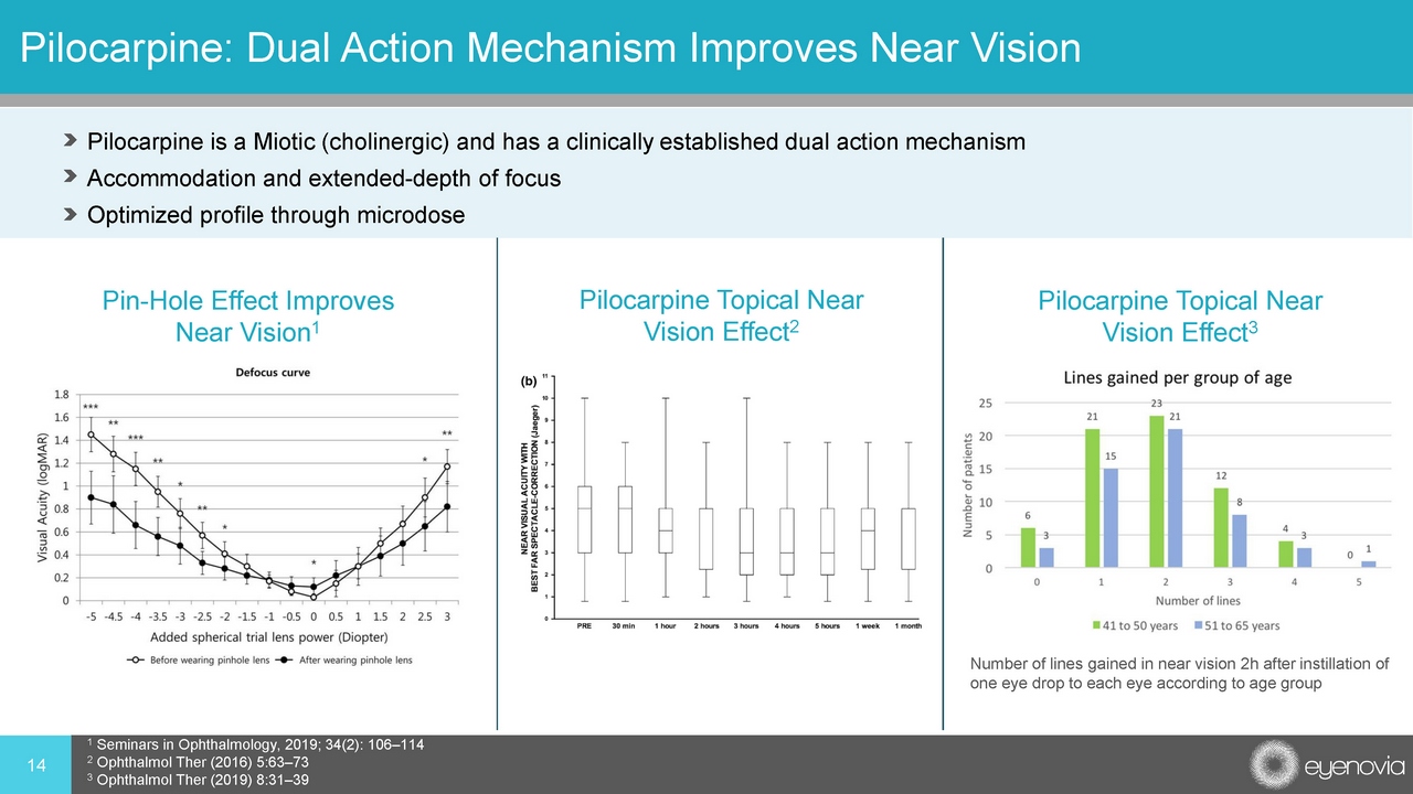 Pilocarpine: Dual Action Mechanism Improves Near Vision Pin - Hole Effect Improves Near Vision 1 Pilocarpine Topical Near Vision Effect 2 Pilocarpine Topical Near Vision Effect 3 1 Seminars in Ophthalmology, 2019; 34(2): 106 – 114 2 Ophthalmol Ther (2016) 5:63 – 73 3 Ophthalmol Ther (2019) 8:31 – 39 Number of lines gained in near vision 2h after instillation of one eye drop to each eye according to age group 14 Pilocarpine is a Miotic (cholinergic) and has a clinically established dual action mechanism Accommodation and extended - depth of focus Optimized profile through microdose