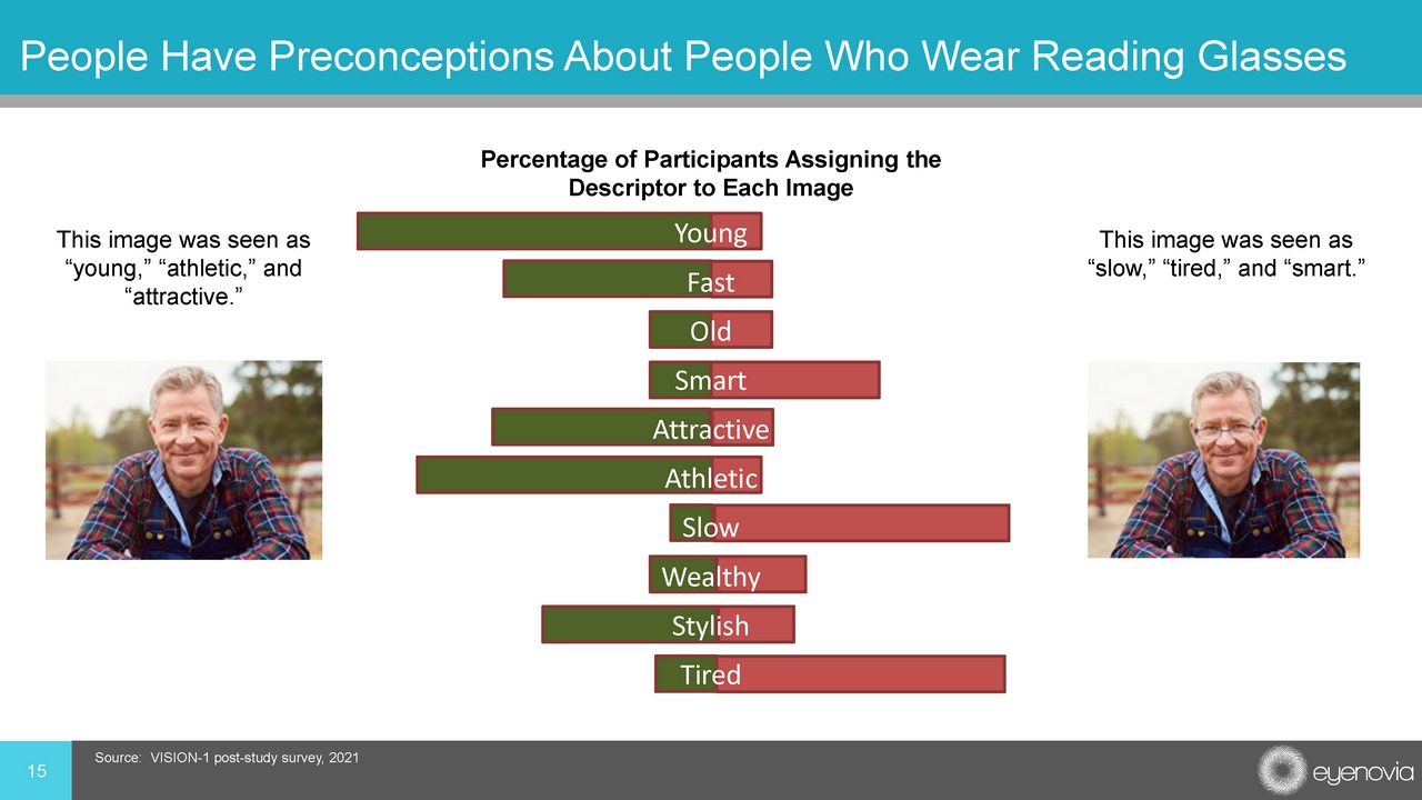 15 People Have Preconceptions About People Who Wear Reading Glasses Young Fast Old Smart Attractive Athletic Slow Wealthy Stylish Tired This image was seen as “young,” “athletic,” and “attractive.” This image was seen as “slow,” “tired,” and “smart.” Percentage of Participants Assigning the Descriptor to Each Image Source: VISION - 1 post - study survey, 2021