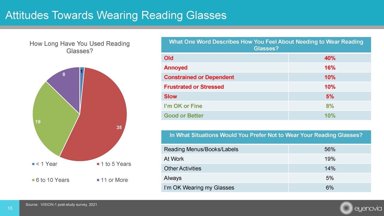 1 35 19 8 How Long Have You Used Reading Glasses? < 1 Year 1 to 5 Years 6 to 10 Years 11 or More 16 Attitudes Towards Wearing Reading Glasses What One Word Describes How You Feel About Needing to Wear Reading Glasses? Old 40% Annoyed 16% Constrained or Dependent 10% Frustrated or Stressed 10% Slow 5% I’m OK or Fine 8% Good or Better 10% In What Situations Would You Prefer Not to Wear Your Reading Glasses? Reading Menus/Books/Labels 56% At Work 19% Other Activities 14% Always 5% I’m OK Wearing my Glasses 6% Source: VISION - 1 post - study survey, 2021