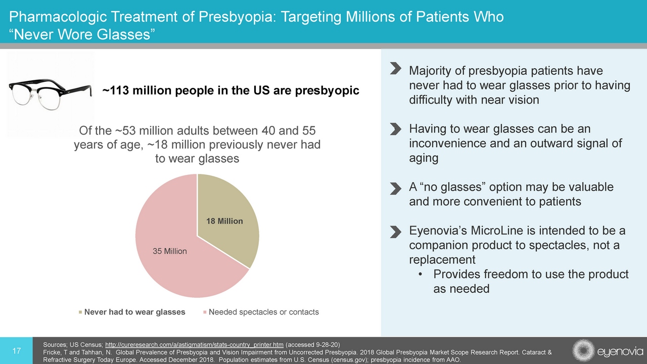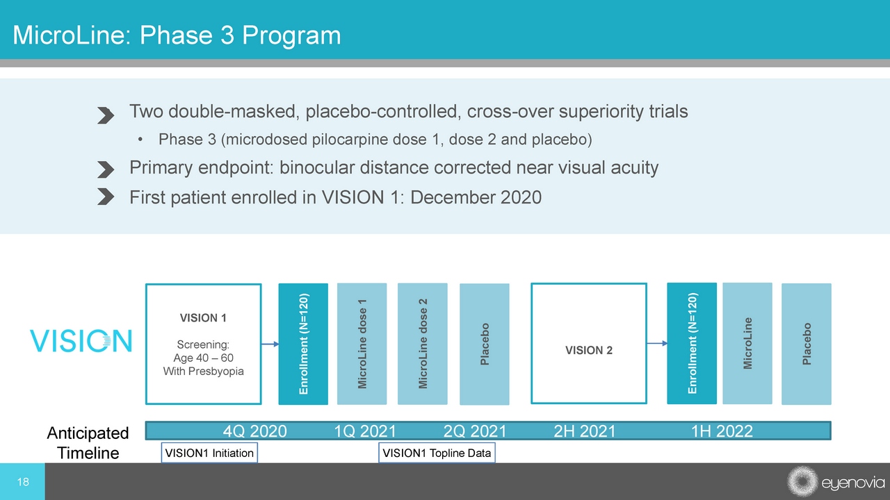 17 Pharmacologic Treatment of Presbyopia: Targeting Millions of Patients Who “Never Wore Glasses” • Majority of presbyopia patients have never had to wear glasses prior to having difficulty with near vision • Having to wear glasses can be an inconvenience and an outward signal of aging • A “no glasses” option may be valuable and more convenient to patients • Eyenovia’s MicroLine is intended to be a companion product to spectacles, not a replacement • Provides freedom to use the product as needed Sources; US Census; http://cureresearch.com/a/astigmatism/stats - country_printer.htm (accessed 9 - 28 - 20) Fricke, T and Tahhan , N. Global Prevalence of Presbyopia and Vision Impairment from Uncorrected Presbyopia. 2018 Global Presbyopia Market Scope Res earch Report. Cataract & Refractive Surgery Today Europe. Accessed December 2018. Population estimates from U.S. Census (census.gov); presbyopia inci den ce from AAO. 18 Million 35 Million Of the ~53 million adults between 40 and 55 years of age, ~18 million previously never had to wear glasses Never had to wear glasses Needed spectacles or contacts ~113 million people in the US are presbyopic