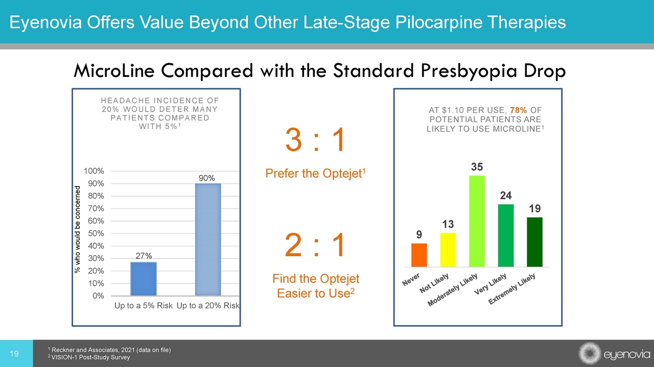 18 MicroLine : Phase 3 Program • Two double - masked, placebo - controlled, cross - over superiority trials • Phase 3 ( microdosed pilocarpine dose 1, dose 2 and placebo) • Primary endpoint: binocular distance corrected near visual acuity • First patient enrolled in VISION 1: December 2020 VISION 1 Screening: Age 40 – 60 With Presbyopia VISION 2 Enrollment (N=120) Enrollment (N=120) MicroLine dose 1 MicroLine dose 2 Placebo MicroLine Placebo 4Q 2020 1Q 2021 2Q 2021 2H 2021 1H 2022 Anticipated Timeline VISION1 Initiation VISION1 Topline Data
