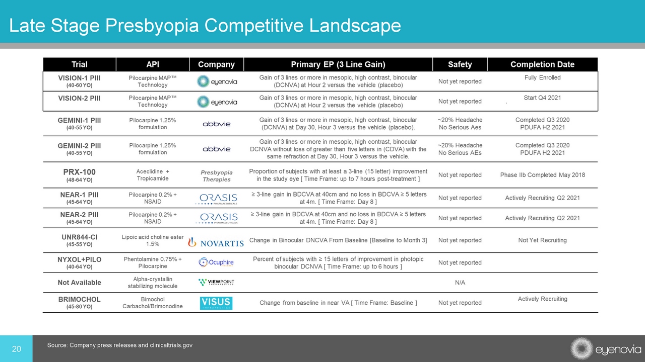 20 Late Stage Presbyopia Competitive Landscape Source: Company press releases and clinicaltrials.gov