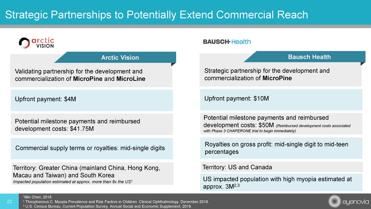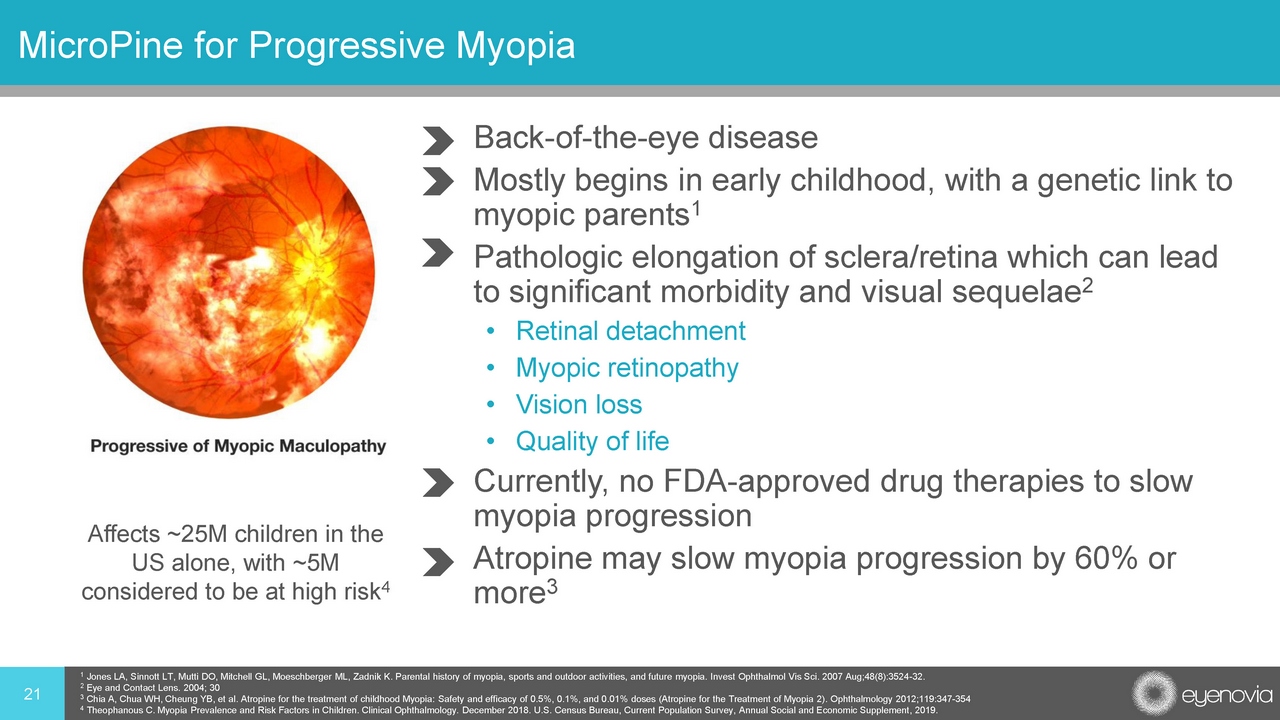 21 MicroPine for Progressive Myopia • Back - of - the - eye disease • Mostly begins in early childhood, with a genetic link to myopic parents 1 • Pathologic elongation of sclera/retina which can lead to significant morbidity and visual sequelae 2 • Retinal detachment • Myopic retinopathy • Vision loss • Quality of life • Currently, no FDA - approved drug therapies to slow myopia progression • Atropine may slow myopia progression by 60% or more 3 1 Jones LA, Sinnott LT, Mutti DO, Mitchell GL, Moeschberger ML, Zadnik K. Parental history of myopia, sports and outdoor activities, and future myopia. Invest Ophthalmol Vis Sci. 2007 Aug;48(8):3524 - 32. 2 Eye and Contact Lens. 2004; 30 3 Chia A, Chua WH, Cheung YB, et al. Atropine for the treatment of childhood Myopia: Safety and efficacy of 0.5%, 0.1%, and 0.0 1% doses (Atropine for the Treatment of Myopia 2). Ophthalmology 2012;119:347 - 354 4 Theophanous C. Myopia Prevalence and Risk Factors in Children. Clinical Ophthalmology. December 2018. U.S. Census Bureau, Cur re nt Population Survey, Annual Social and Economic Supplement, 2019. Affects ~25M children in the US alone, with ~5M considered to be at high risk 4