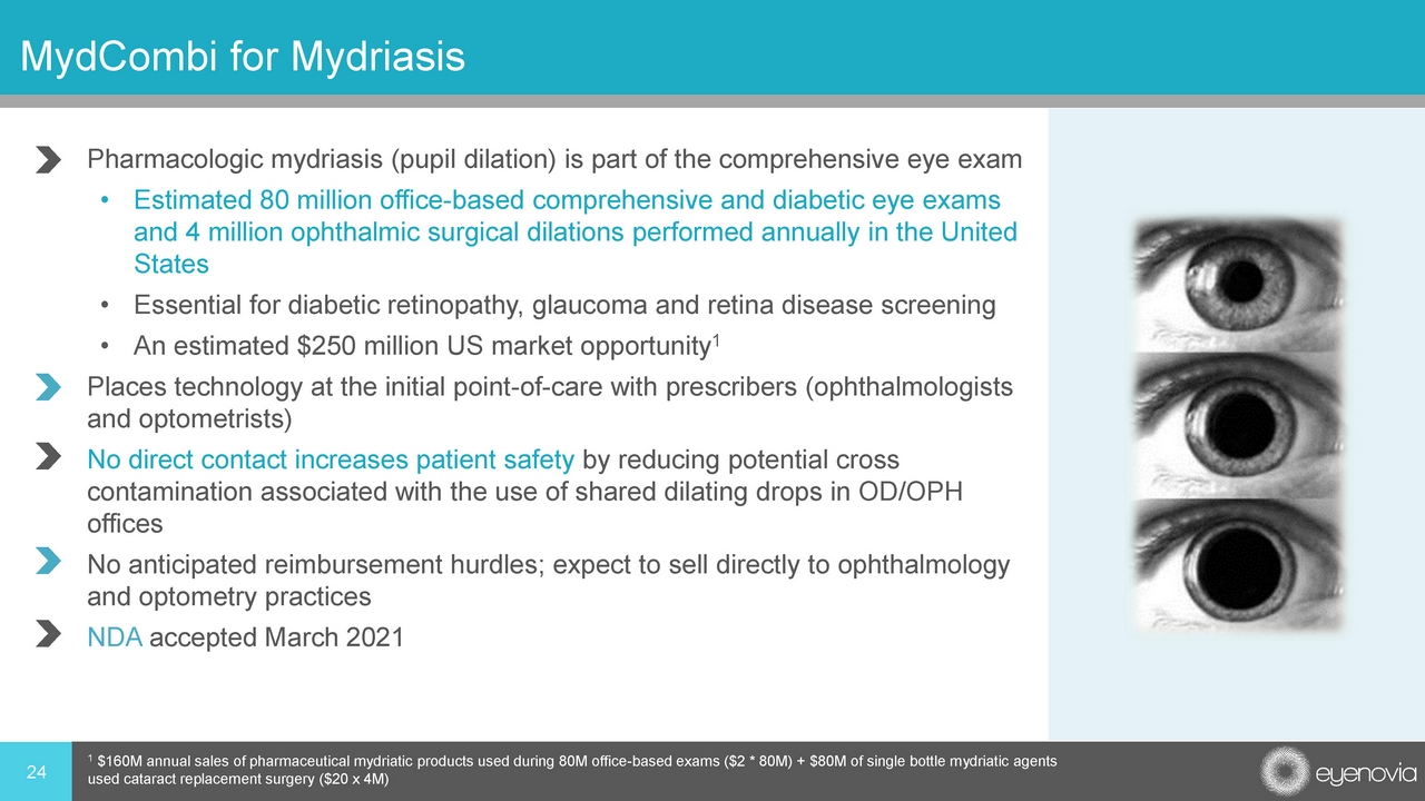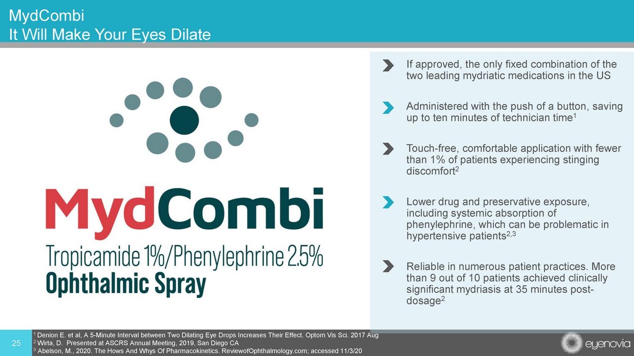 • Pharmacologic mydriasis (pupil dilation) is part of the comprehensive eye exam • Estimated 80 million office - based comprehensive and diabetic eye exams and 4 million ophthalmic surgical dilations performed annually in the United States • Essential for diabetic retinopathy, glaucoma and retina disease screening • An estimated $250 million US market opportunity 1 • Places technology at the initial point - of - care with prescribers (ophthalmologists and optometrists) • No direct contact increases patient safety by reducing potential cross contamination associated with the use of shared dilating drops in OD/OPH offices • No anticipated reimbursement hurdles; expect to sell directly to ophthalmology and optometry practices • NDA accepted March 2021 24 MydCombi for Mydriasis 1 $160M annual sales of pharmaceutical mydriatic products used during 80M office - based exams ($2 * 80M) + $80M of single bottle m ydriatic agents used cataract replacement surgery ($20 x 4M)