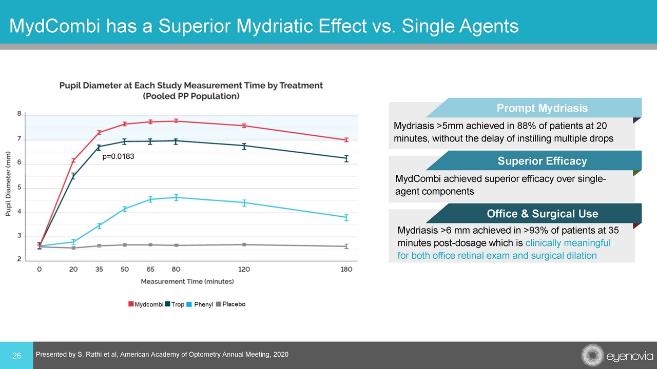 25 MydCombi It Will Make Your Eyes Dilate • If approved, the only fixed combination of the two leading mydriatic medications in the US • Administered with the push of a button, saving up to ten minutes of technician time 1 • Touch - free, comfortable application with fewer than 1% of patients experiencing stinging discomfort 2 • Lower drug and preservative exposure, including systemic absorption of phenylephrine, which can be problematic in hypertensive patients 2,3 • Reliable in numerous patient practices. More than 9 out of 10 patients achieved clinically significant mydriasis at 35 minutes post - dosage 2 1 Denion E. et al, A 5 - Minute Interval between Two Dilating Eye Drops Increases Their Effect. Optom Vis Sci. 2017 Aug 2 Wirta , D. Presented at ASCRS Annual Meeting, 2019, San Diego CA 3 Abelson, M., 2020. The Hows And Whys Of Pharmacokinetics. ReviewofOphthalmology.com; accessed 11/3/20