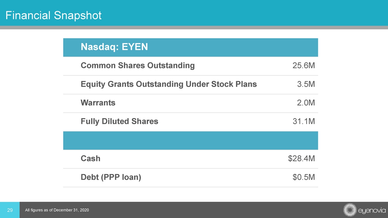 Financial Snapshot 29 Nasdaq: EYEN Common Shares Outstanding 25.6M Equity Grants Outstanding Under Stock Plans 3.5M Warrants 2.0M Fully Diluted Shares 31.1M Cash $28.4M Debt (PPP loan) $0.5M All figures as of December 31, 2020