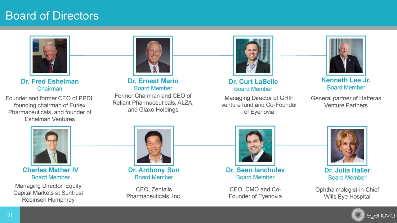 Board of Directors Dr. Fred Eshelman Chairman Founder and former CEO of PPDI, founding chairman of Furiex Pharmaceuticals, and founder of Eshelman Ventures Dr. Ernest Mario Board Member Former Chairman and CEO of Reliant Pharmaceuticals, ALZA, and Glaxo Holdings Dr. Curt LaBelle Board Member Managing Director of GHIF venture fund and Co - Founder of Eyenovia General partner of Hatteras Venture Partners Kenneth Lee Jr. Board Member Managing Director, Equity Capital Markets at Suntrust Robinson Humphrey Charles Mather IV Board Member CEO, Zentalis Pharmaceuticals, Inc. Dr. Anthony Sun Board Member 31 CEO, CMO and Co - Founder of Eyenovia Dr. Sean Ianchulev Board Member Ophthalmologist - in - Chief Wills Eye Hospital Dr. Julia Haller Board Member