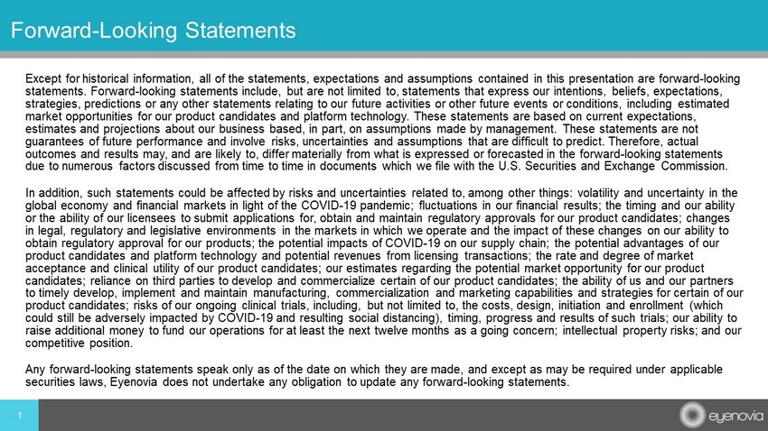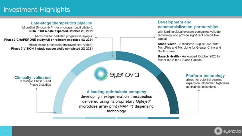 Except for historical information, all of the statements, expectations and assumptions contained in this presentation are for war d - looking statements. Forward - looking statements include, but are not limited to, statements that express our intentions, beliefs, expecta tions, strategies, predictions or any other statements relating to our future activities or other future events or conditions, inclu din g estimated market opportunities for our product candidates and platform technology. These statements are based on current expectations, estimates and projections about our business based, in part, on assumptions made by management. These statements are not guarantees of future performance and involve risks, uncertainties and assumptions that are difficult to predict. Therefore, a ctu al outcomes and results may, and are likely to, differ materially from what is expressed or forecasted in the forward - looking state ments due to numerous factors discussed from time to time in documents which we file with the U.S. Securities and Exchange Commissi on. In addition, such statements could be affected by risks and uncertainties related to, among other things: volatility and unce rta inty in the global economy and financial markets in light of the COVID - 19 pandemic; fluctuations in our financial results; the timing and our ability or the ability of our licensees to submit applications for, obtain and maintain regulatory approvals for our product candidat es; changes in legal, regulatory and legislative environments in the markets in which we operate and the impact of these changes on our a bil ity to obtain regulatory approval for our products; the potential impacts of COVID - 19 on our supply chain; the potential advantages of our product candidates and platform technology and potential revenues from licensing transactions; the rate and degree of market acceptance and clinical utility of our product candidates; our estimates regarding the potential market opportunity for our p rod uct candidates; reliance on third parties to develop and commercialize certain of our product candidates; the ability of us and o ur partners to timely develop, implement and maintain manufacturing, commercialization and marketing capabilities and strategies for cert ain of our product candidates; risks of our ongoing clinical trials, including, but not limited to, the costs, design, initiation and en rol lment (which could still be adversely impacted by COVID - 19 and resulting social distancing), timing, progress and results of such trials; our ability to raise additional money to fund our operations for at least the next twelve months as a going concern ; intellectual property risks; and our competitive position. Any forward - looking statements speak only as of the date on which they are made, and except as may be required under applicable securities laws, Eyenovia does not undertake any obligation to update any forward - looking statements. 1 Forward - Looking Statements