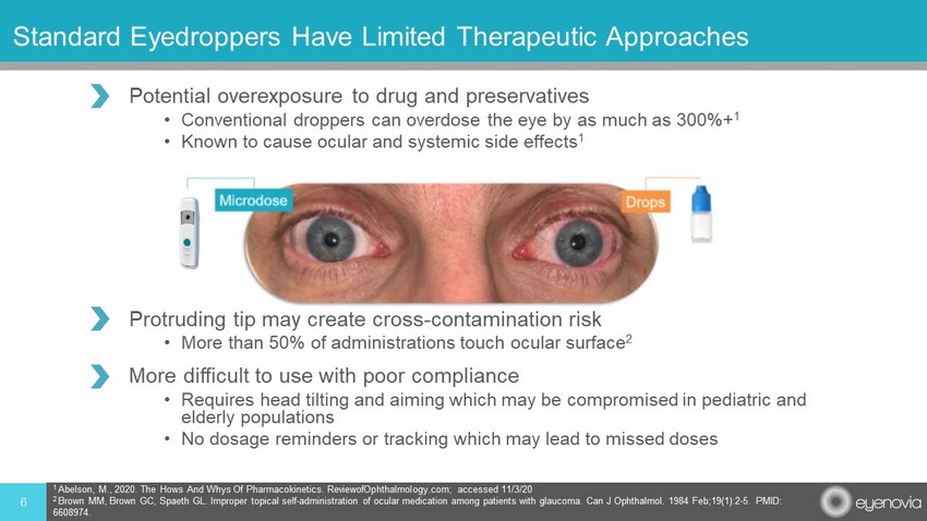 5 Potential Topical US Ophthalmic Market For Platform Technology* Lifestyle Enhancement Glaucoma: ~$3 Billion 3 Prescription Dry Eye: ~$1.6 Billion 2 Anti - Inflammatories: ~$1.4 Billion 1 Reduce IOP spikes due to high doses of steroids. Anti - Infectives: ~$650 Million 1 Eliminate contamination from poor usage of eyedropper bottles. *All potential market opportunities are estimates only 4 Estimate from Delveinsight Presbyopia Report, December 2020 1 IMS, 2015 2 Mixture of public information, IQVIA , Market Scope and estimates – Feb 2020 3 IQVIA, 2019 Improve systemic safety profile and allow for development of PGA + BB fixed combinations. Improvement in topical (e.g., hyperemia) and systemic AE profile. Multi - dose preservative free options. Improve clinical probability of success. Enable patients, especially the elderly, to better instill medication for improved results. Multi - dose preservative free options. Current Portfolio: ~$12.9 Billion* Existing Eyenovia portfolio in mydriasis, presbyopia, and myopia, with late - stage, first - in - class therapeutics. $0.0 $1.0 $2.0 $3.0 $4.0 $5.0 $6.0 $7.0 $8.0 Market Size Estimates for the United States (in US$ Billions)