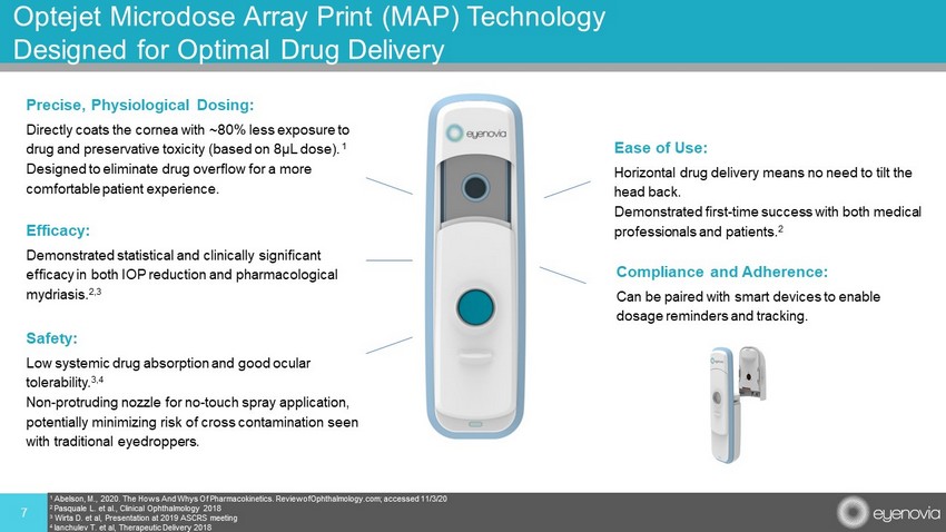 Potential overexposure to drug and preservatives • Conventional droppers can overdose the eye by as much as 300%+ 1 • Known to cause ocular and systemic side effects 1 Protruding tip may create cross - contamination risk • More than 50% of administrations touch ocular surface 2 More difficult to use with poor compliance • Requires head tilting and aiming which may be compromised in pediatric and elderly populations • No dosage reminders or tracking which may lead to missed doses 6 Standard Eyedroppers Have Limited Therapeutic Approaches 1 Abelson, M., 2020. The Hows And Whys Of Pharmacokinetics. ReviewofOphthalmology.com; accessed 11/3/20 2 Brown MM, Brown GC, Spaeth GL. Improper topical self - administration of ocular medication among patients with glaucoma. Can J Ophthalmol . 1984 Feb;19(1):2 - 5. PMID: 6608974.