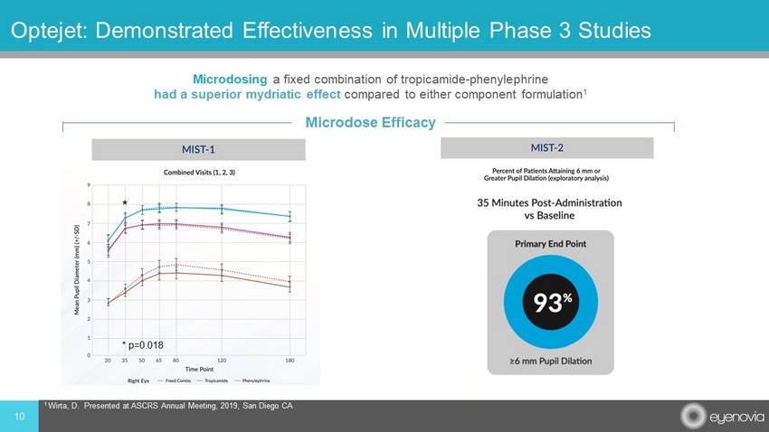 9 Optejet : Clinical Experience and Validation 0 50 100 150 200 250 300 350 PE 2.5% PE 10% PE 10% μ D Plasma PE ( pg /ml) 101.6 316.3 201.5 p = 0.003 p = 0.021 Drugs in traditional eyedroppers can enter systemic blood circulation and may cause significant side effects . 1 Microdose delivery of phenylephrine 10% (PE - µD) was associated with significantly less systemic exposure than traditional eye drops (PE 10%). 2 Reduced Systemic Levels 1 Muller, M., van der Velpe , N., Jaap, W., van der Cammen , T.; Syncope and falls due to timolol eye drops. BMJ, 2006 April; 332:960 - 961 2 Ianchulev, I. High - precision piezo - ejection ocular microdosing : Phase II study on local and systemic effects of topical phenylephrine. Ther Deliv , 2018 Jan;9(1):17 - 27