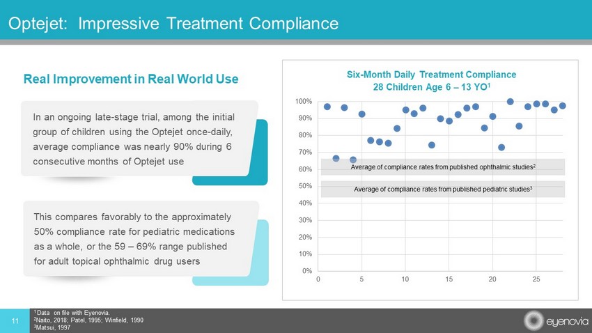 0% 10% 20% 30% 40% 50% 60% 70% 80% 90% 100% 0 5 10 15 20 25 Six - Month Daily Treatment Compliance 28 Children Age 6 – 13 YO 1 11 Optejet : Impressive Treatment Compliance 1 Data on file with Eyenovia. 2 Naito, 2018; Patel, 1995; Winfield, 1990 3 Matsui, 1997 Real Improvement in Real World Use Average of compliance rates from published ophthalmic studies 2 Average of compliance rates from published pediatric studies 3 This compares favorably to the approximately 50% compliance rate for pediatric medications as a whole, or the 59 – 69% range published for adult topical ophthalmic drug users In an ongoing late - stage trial, among the initial group of children using the Optejet once - daily, average compliance was nearly 90% during 6 consecutive months of Optejet use