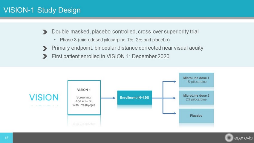 14 MicroLine Achieves Primary Endpoint in Phase 3 May 2021: Phase 3 VISION - 1 trial achieves primary endpoint Statistically significant proportion of subjects in treatment arm achieved three - line or more improvement in distance corrected near visual acuity Well tolerated with only mild adverse events; less than 3% brow ache 71% of study participants reported strong interest in using MicroLine if approved Registrational Phase 3 VISION - 2 study planned for H2 2021 Topline data anticipated in H1 2022