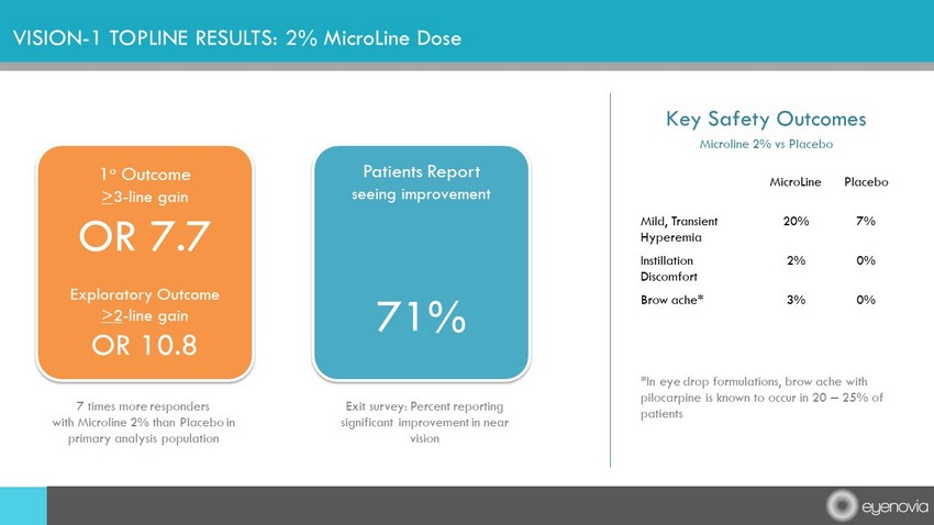 VISION - 1 TOPLINE RESULTS: 2% MicroLine Dose 1 o Outcome > 3 - line gain OR 7.7 Exploratory Outcome >2 - line gain OR 10.8 7 times more responders with Microline 2% than Placebo in primary analysis population Patients Report seeing improvement 71% Exit survey: Percent reporting significant improvement in near vision Key Safety Outcomes Microline 2% vs Placebo *In eye drop formulations, brow ache with pilocarpine is known to occur in 20 – 25% of patients MicroLine Placebo Mild, Transient Hyperemia 20% 7% Instillation Discomfort 2% 0% Brow ache* 3% 0%