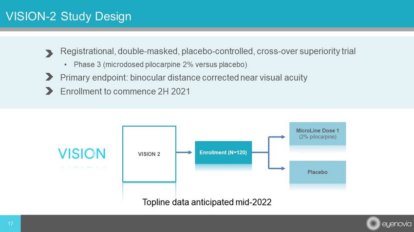15 VISION - 1 Study Design • Double - masked, placebo - controlled, cross - over superiority trial • Phase 3 ( microdosed pilocarpine 1%, 2% and placebo) • Primary endpoint: binocular distance corrected near visual acuity • First patient enrolled in VISION 1: December 2020 VISION 1 Screening: Age 40 – 60 With Presbyopia Enrollment (N=120) MicroLine dose 1 1% pilocarpine MicroLine dose 2 2% pilocarpine Placebo