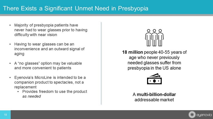 17 VISION - 2 Study Design VISION 2 Enrollment (N=120) MicroLine Dose 1 (2% pilocarpine) Placebo Topline data anticipated mid - 2022 • Registrational, double - masked, placebo - controlled, cross - over superiority trial • Phase 3 ( microdosed pilocarpine 2% versus placebo) • Primary endpoint: binocular distance corrected near visual acuity • Enrollment to commence 2H 2021