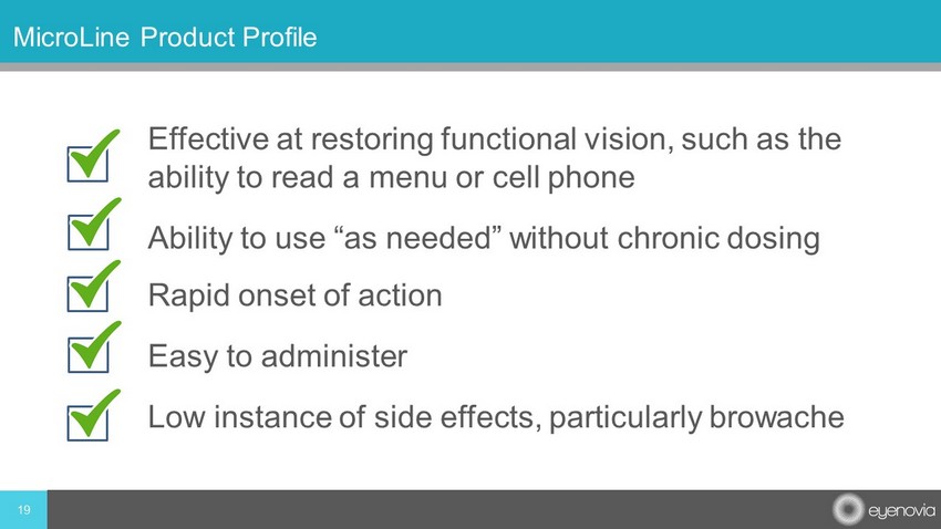 18 There Exists a Significant Unmet Need in Presbyopia 18 million people 40 - 55 years of age who never previously needed glasses suffer from presbyopia in the US alone A multi - billion - dollar addressable market • Majority of presbyopia patients have never had to wear glasses prior to having difficulty with near vision • Having to wear glasses can be an inconvenience and an outward signal of aging • A “no glasses” option may be valuable and more convenient to patients • Eyenovia’s MicroLine is intended to be a companion product to spectacles, not a replacement • Provides freedom to use the product as needed