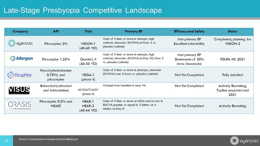 20 Late - Stage Presbyopia Competitive Landscape Source: Company press releases and clinicaltrials.gov Company API Trial Primary EP Efficacy and Safety Status Pilocarpine 2% VISION - 1 (40 - 60 YO) Gain of 3 lines or more in mesopic, high contrast, binocular (DCNVA) at Hour 2 vs. placebo (vehicle) Met primary EP Excellent tolerability Completed; planning for VISION - 2 Pilocarpine 1.25% Gemini I, II (40 - 55 YO) Gain of 3 lines or more in mesopic, high contrast, binocular (DCNVA) at Day 30, Hour 3 vs. placebo (vehicle) Met primary EP Statements of 20% brow/headache PDUFA H2 2021 Nyxol (phentolamine 0.75%) and pilocarpine VEGA - 1 (phase II) Gain of 3 lines or more in photopic, binocular (DCNVA) over 6 hours vs. placebo (vehicle) Not Yet Completed Fully enrolled Brimochol (carbachol and brimonidine) NCT04774237 (phase II) Change from baseline in near VA Not Yet Completed Actively Recruiting; Topline expected mid 2021 Pilocarpine 0.2% and NSAID NEAR - 1 NEAR - 2 (45 - 64 YO) Gain of 3 lines or more at 40cm and no loss in BDCVA greater or equal to 5 letters at 4 meters on Day 8 Not Yet Completed Actively Recruiting