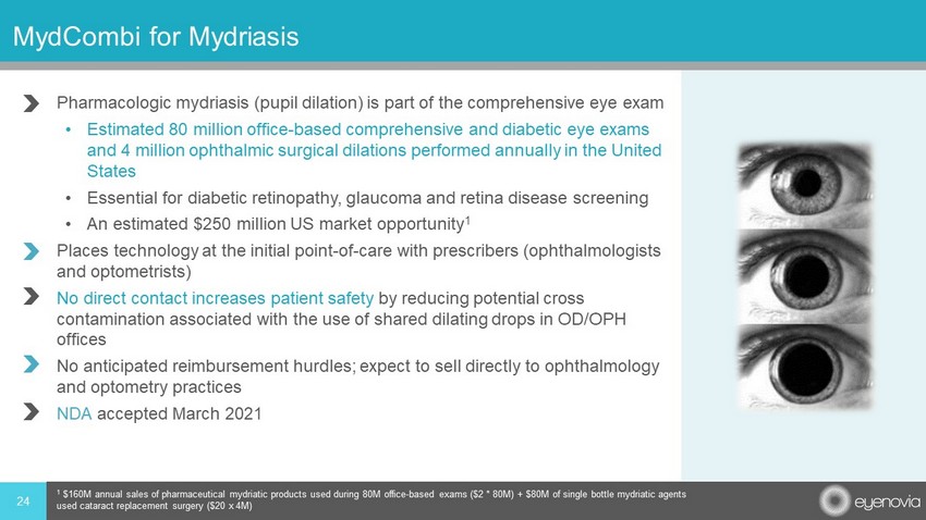 • Pharmacologic mydriasis (pupil dilation) is part of the comprehensive eye exam • Estimated 80 million office - based comprehensive and diabetic eye exams and 4 million ophthalmic surgical dilations performed annually in the United States • Essential for diabetic retinopathy, glaucoma and retina disease screening • An estimated $250 million US market opportunity 1 • Places technology at the initial point - of - care with prescribers (ophthalmologists and optometrists) • No direct contact increases patient safety by reducing potential cross contamination associated with the use of shared dilating drops in OD/OPH offices • No anticipated reimbursement hurdles; expect to sell directly to ophthalmology and optometry practices • NDA accepted March 2021 24 MydCombi for Mydriasis 1 $160M annual sales of pharmaceutical mydriatic products used during 80M office - based exams ($2 * 80M) + $80M of single bottle m ydriatic agents used cataract replacement surgery ($20 x 4M)