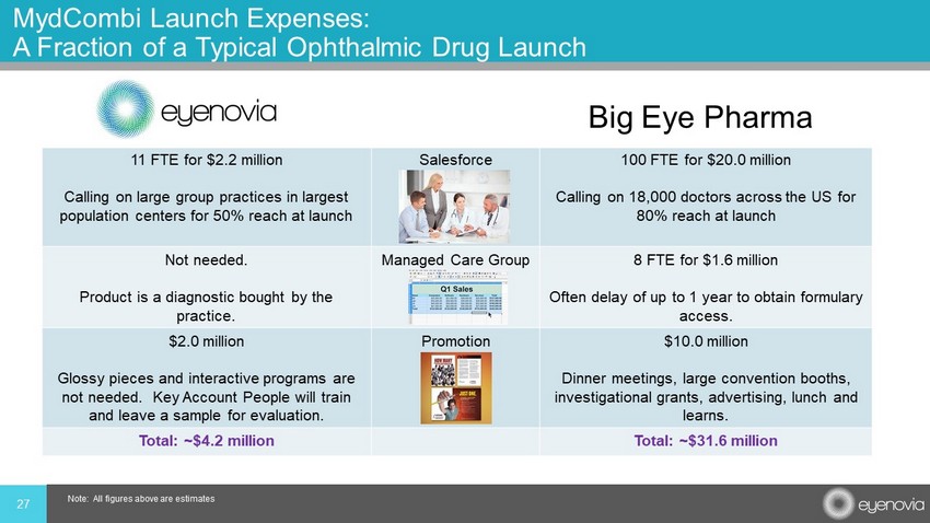 11 FTE for $2.2 million Calling on large group practices in largest population centers for 50% reach at launch Salesforce 100 FTE for $20.0 million Calling on 18,000 doctors across the US for 80% reach at launch Not needed. Product is a diagnostic bought by the practice. Managed Care Group 8 FTE for $1.6 million Often delay of up to 1 year to obtain formulary access. $2.0 million Glossy pieces and interactive programs are not needed. Key Account People will train and leave a sample for evaluation. Promotion $10.0 million Dinner meetings, large convention booths, investigational grants, advertising, lunch and learns. Total: ~$4.2 million Total: ~$31.6 million 27 MydCombi Launch Expenses: A Fraction of a Typical Ophthalmic Drug Launch Note: All figures above are estimates Big Eye Pharma
