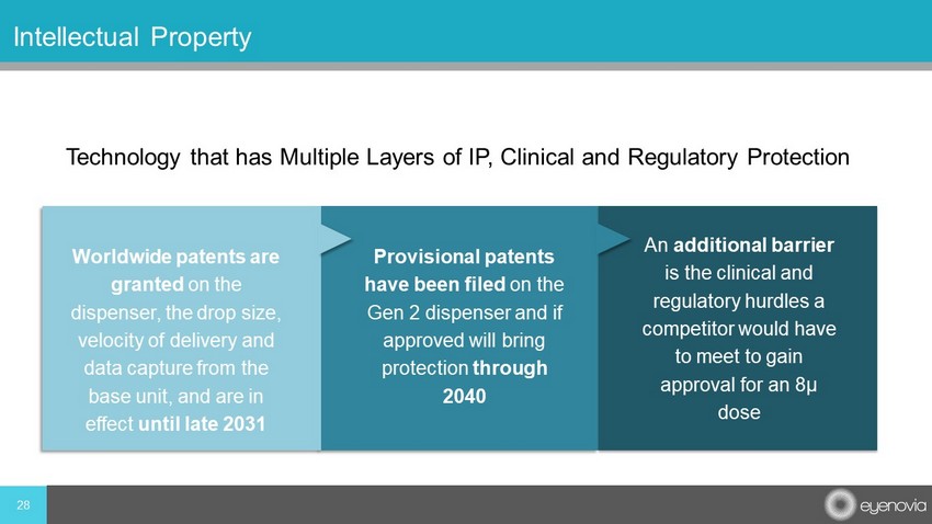 28 Intellectual Property An additional barrier is the clinical and regulatory hurdles a competitor would have to meet to gain approval for an 8µ dose Worldwide patents are granted on the dispenser, the drop size, velocity of delivery and data capture from the base unit, and are in effect until late 2031 Provisional patents have been filed on the Gen 2 dispenser and if approved will bring protection through 2040 Technology that has Multiple Layers of IP, Clinical and Regulatory Protection