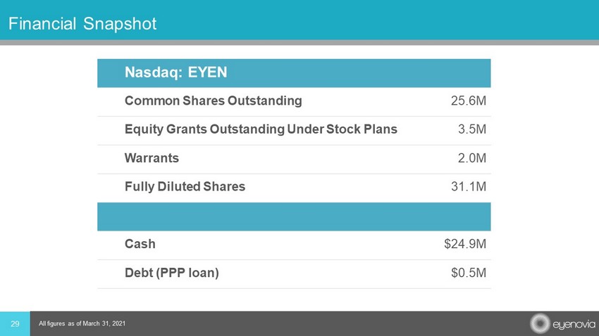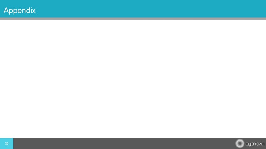 Financial Snapshot 29 Nasdaq: EYEN Common Shares Outstanding 25.6M Equity Grants Outstanding Under Stock Plans 3.5M Warrants 2.0M Fully Diluted Shares 31.1M Cash $24.9M Debt (PPP loan) $0.5M All figures as of March 31, 2021