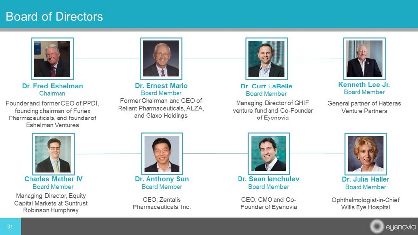 Board of Directors Dr. Fred Eshelman Chairman Founder and former CEO of PPDI, founding chairman of Furiex Pharmaceuticals, and founder of Eshelman Ventures Dr. Ernest Mario Board Member Former Chairman and CEO of Reliant Pharmaceuticals, ALZA, and Glaxo Holdings Dr. Curt LaBelle Board Member Managing Director of GHIF venture fund and Co - Founder of Eyenovia General partner of Hatteras Venture Partners Kenneth Lee Jr. Board Member Managing Director, Equity Capital Markets at Suntrust Robinson Humphrey Charles Mather IV Board Member CEO, Zentalis Pharmaceuticals, Inc. Dr. Anthony Sun Board Member 31 CEO, CMO and Co - Founder of Eyenovia Dr. Sean Ianchulev Board Member Ophthalmologist - in - Chief Wills Eye Hospital Dr. Julia Haller Board Member
