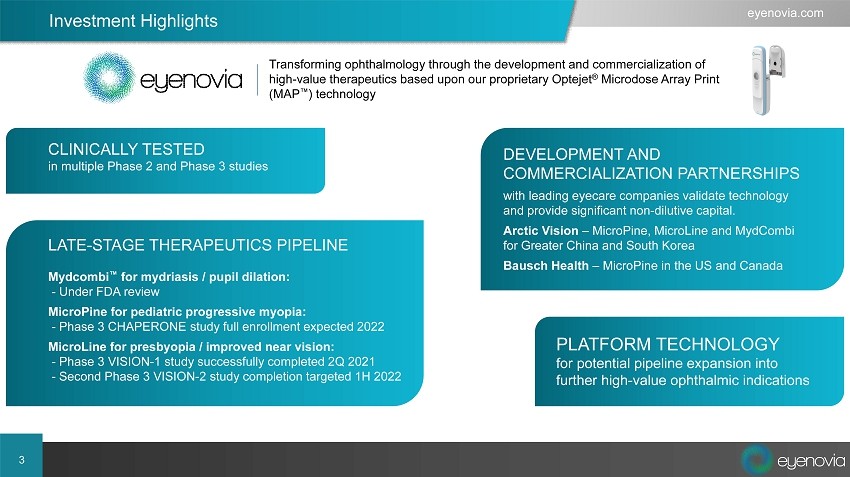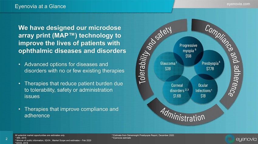 eyenovia.com 1 Except for historical information, all the statements, expectations and assumptions contained in this presentation are forward - looking statements. Forward - looking statements include, but are not limited to, statements that express our intentions, beliefs, expectations, strategies, predictions or any other statements relating to our future activities or other future events or conditions, including estimated market opportunities for our product candidates and platform technology. These statements are based on current expectations, estimates and projections about our business based, in part, on assumptions made by management. These statements are not guarantees of future performance and involve risks, uncertainties and assumptions that are difficult to predict. Therefore, actual outcomes and results may, and in some cases are likely to, differ materially from what is expressed or forecasted in the forward - looking statements due to numerous factors discussed from time to time in documents which we file with the U.S. Securities and Exchange Commission. In addition, such statements could be affected by risks and uncertainties related to, among other things: risks of our clinical trials, including, but not limited to, the costs, design, initiation and enrollment (which could still be adversely impacted by COVID - 19 and resulting social distancing), timing, progress and results of such trials; the timing of, and our ability to submit applications for, obtaining and maintaining regulatory approvals for our product candidates; the potential impacts of COVID - 19 and related economic disruptions on our supply chain, including the availability of sufficient components and materials used in our product candidates; the potential advantages of our product candidates and platform technology; the rate and degree of market acceptance and clinical utility of our product candidates; our estimates regarding the potential market opportunity for our product candidates; reliance on third parties to develop and commercialize our product candidates; the ability of us and our partners to timely develop, implement and maintain manufacturing, commercialization and marketing capabilities and strategies for our product candidates; intellectual property risks; changes in legal, regulatory and legislative environments in the markets in which we operate and the impact of these changes on our ability to obtain regulatory approval for our products; and our competitive position. Any forward - looking statements speak only as of the date on which they are made, and except as may be required under applicable securities laws, Eyenovia does not undertake any obligation to update any forward - looking statements. Forward - Looking Statements