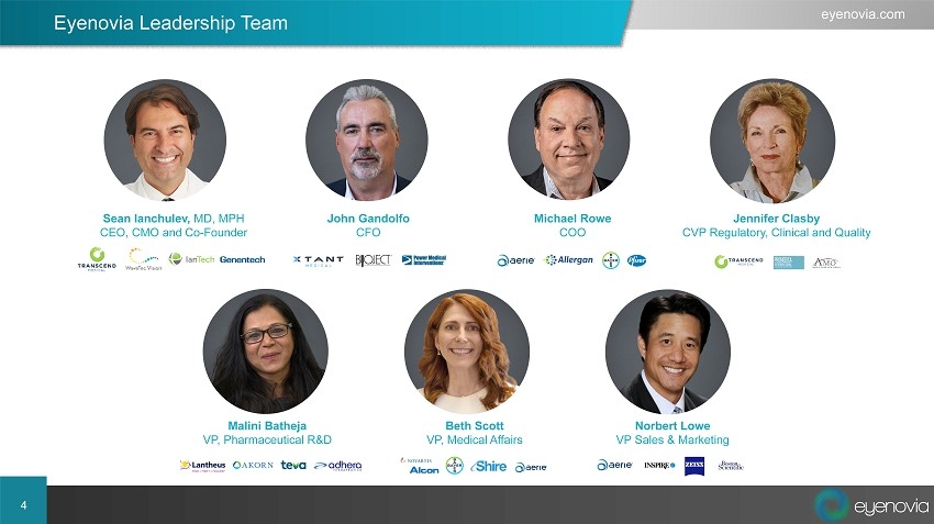 eyenovia.com LATE - STAGE THERAPEUTICS PIPELINE Mydcombi Œ for mydriasis / pupil dilation: - Under FDA review MicroPine for pediatric progressive myopia: - Phase 3 CHAPERONE study full enrollment expected 2022 MicroLine for presbyopia / improved near vision: - Phase 3 VISION - 1 study successfully completed 2Q 2021 - Second Phase 3 VISION - 2 study completion targeted 1H 2022 3 DEVELOPMENT AND COMMERCIALIZATION PARTNERSHIPS with leading eyecare companies validate technology and provide significant non - dilutive capital. Arctic Vision – MicroPine , MicroLine and MydCombi for Greater China and South Korea Bausch Health – MicroPine in the US and Canada PLATFORM TECHNOLOGY for potential pipeline expansion into further high - value ophthalmic indications Transforming ophthalmology through the development and commercialization of high - value therapeutics based upon our proprietary Optejet ® Microdose Array Print (MAP Œ ) technology CLINICALLY TESTED in multiple Phase 2 and Phase 3 studies Investment Highlights