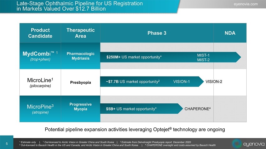 eyenovia.com 4 Eyenovia Leadership Team Sean Ianchulev, MD, MPH CEO, CMO and Co - Founder John Gandolfo CFO Michael Rowe COO Jennifer Clasby CVP Regulatory, Clinical and Quality Malini Batheja VP, Pharmaceutical R&D Norbert Lowe VP Sales & Marketing Beth Scott VP, Medical Affairs