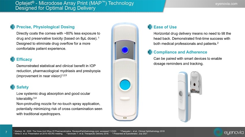 eyenovia.com Potential overexposure to drug and preservatives • Conventional droppers can overdose the eye by as much as 300%+ 1 • Known to cause ocular and systemic side effects 1 Protruding tip may create cross - contamination risk • More than 50% of administrations touch ocular surface 2 More difficult to use with poor compliance • Requires head tilting and aiming which may be compromised in pediatric and elderly populations • No dosage reminders or tracking which may lead to missed doses 6 1 Abelson, M., 2020. The Hows And Whys Of Pharmacokinetics. ReviewofOphthalmology.com; accessed 11/3/20 2 Brown MM, Brown GC, Spaeth GL. Improper topical self - administration of ocular medication among patients with glaucoma. Can J Ophthalmol . 1984 Feb;19(1):2 - 5. PMID: 6608974. Standard Eyedroppers Have Limited Therapeutic Approaches