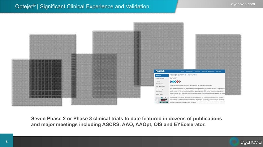 eyenovia.com 8 Optejet ® | Significant Clinical Experience and Validation Seven Phase 2 or Phase 3 clinical trials to date featured in dozens of publications and major meetings including ASCRS, AAO, AAOpt , OIS and EYEcelerator .