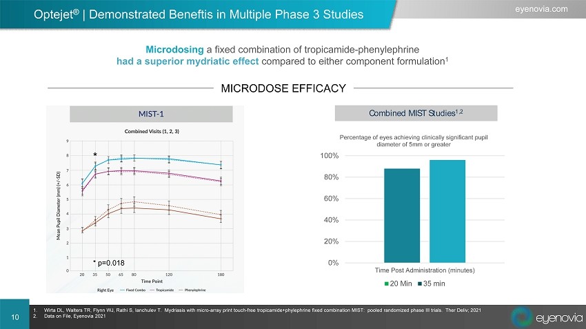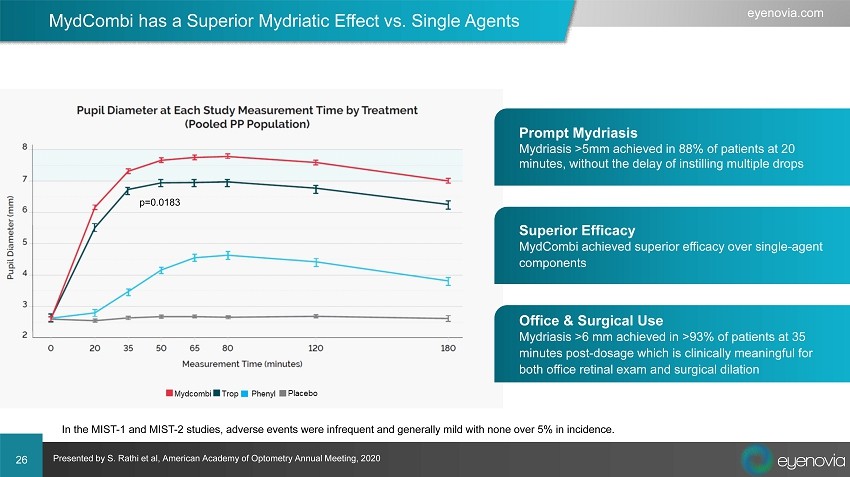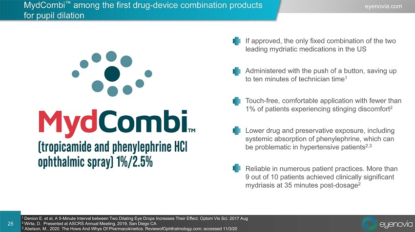 eyenovia.com 25 MydCombi Œ among the first drug - device combination products for pupil dilation If approved, the only fixed combination of the two leading mydriatic medications in the US Administered with the push of a button, saving up to ten minutes of technician time 1 Touch - free, comfortable application with fewer than 1% of patients experiencing stinging discomfort 2 Lower drug and preservative exposure, including systemic absorption of phenylephrine, which can be problematic in hypertensive patients 2,3 Reliable in numerous patient practices. More than 9 out of 10 patients achieved clinically significant mydriasis at 35 minutes post - dosage 2 1 Denion E. et al, A 5 - Minute Interval between Two Dilating Eye Drops Increases Their Effect. Optom Vis Sci. 2017 Aug 2 Wirta , D. Presented at ASCRS Annual Meeting, 2019, San Diego CA 3 Abelson, M., 2020. The Hows And Whys Of Pharmacokinetics. ReviewofOphthalmology.com; accessed 11/3/20