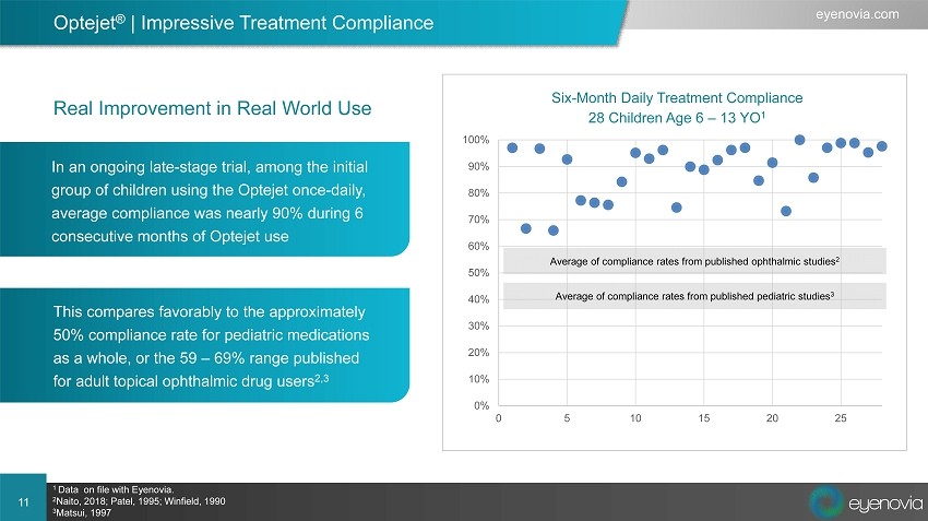 eyenovia.com 10 Microdosing a fixed combination of tropicamide - phenylephrine had a superior mydriatic effect compared to either component formulation 1 MICRODOSE EFFICACY 1. Wirta DL, Walters TR, Flynn WJ, Rathi S, Ianchulev T. Mydriasis with micro - array print touch - free tropicamide+phylephrine fixed combination MIST: pooled randomized phase III trials. Ther Deliv ; 2021 2. Data on File, Eyenovia 2021 * * p=0.018 Combined MIST Studies 1,2 0% 20% 40% 60% 80% 100% Time Post Administration (minutes) Percentage of eyes achieving clinically significant pupil diameter of 5mm or greater 20 Min 35 min Optejet ® | Demonstrated Beneftis in Multiple Phase 3 Studies