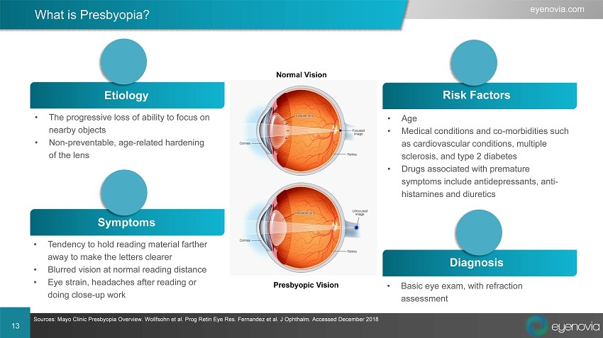 eyenovia.com 13 What is Presbyopia? Etiology • The progressive loss of ability to focus on nearby objects • Non - preventable, age - related hardening of the lens Sources: Mayo Clinic Presbyopia Overview. Wollfsohn et al. Prog Retin Eye Res. Fernandez et al. J Ophthalm . Accessed December 2018 Symptoms • Tendency to hold reading material farther away to make the letters clearer • Blurred vision at normal reading distance • Eye strain, headaches after reading or doing close - up work Risk Factors • Age • Medical conditions and co - morbidities such as cardiovascular conditions, multiple sclerosis, and type 2 diabetes • Drugs associated with premature symptoms include antidepressants, anti - histamines and diuretics Diagnosis • Basic eye exam, with refraction assessment Normal Vision Presbyopic Vision