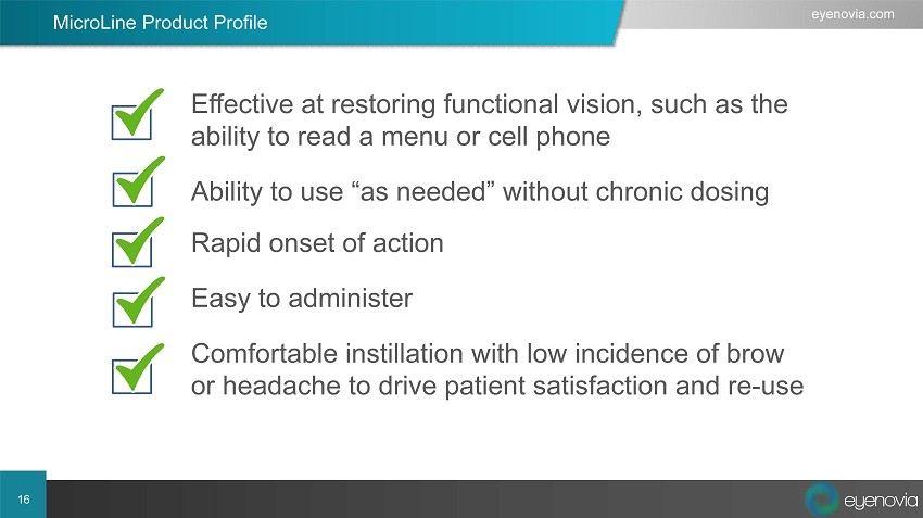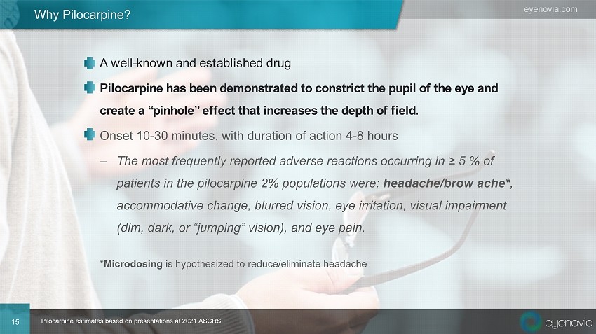 eyenovia.com 15 Why Pilocarpine? A well - known and established drug Pilocarpine has been demonstrated to constrict the pupil of the eye and create a “pinhole” effect that increases the depth of field . Onset 10 - 30 minutes, with duration of action 4 - 8 hours ‒ The most frequently reported adverse reactions occurring in ≥ 5 % of patients in the pilocarpine 2% populations were: headache/brow ache* , accommodative change, blurred vision, eye irritation, visual impairment (dim, dark, or “jumping” vision), and eye pain. * Microdosing is hypothesized to reduce/eliminate headache Pilocarpine estimates based on presentations at 2021 ASCRS