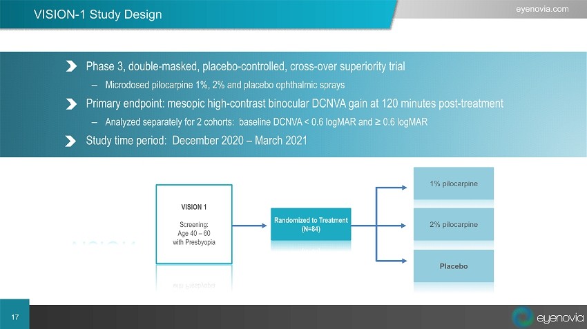 eyenovia.com 16 MicroLine Product Profile Effective at restoring functional vision, such as the ability to read a menu or cell phone Ability to use “as needed” without chronic dosing Rapid onset of action Easy to administer Comfortable instillation with low incidence of brow or headache to drive patient satisfaction and re - use