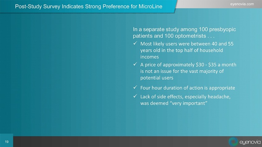 eyenovia.com Key Safety Outcomes All AEs were Transient in Nature 1 Resolved by 3 hours post - dose 2 Cohort of subjects with baseline DCNVA < 0.6 logMAR MicroLine Placebo Moderate Hyperemia 1 2% 0% Instillation Discomfort 2% 0% Brow ache 2% 0% 0 50 100 Upon Instillation 30 minutes post dose Patient Comfort Assessment Placebo MicroLine Very Little Discomfort Quite a bit of Discomfort 1 o Outcome > 3 - line gain OR 7.7 p - value<0.05 Patients Report seeing improvement 71% Exit survey: Percent reporting significant improvement in near vision 2 VISION - 1 Met Primary Endpoint Formulation is Well - Tolerated and Comfortable 18