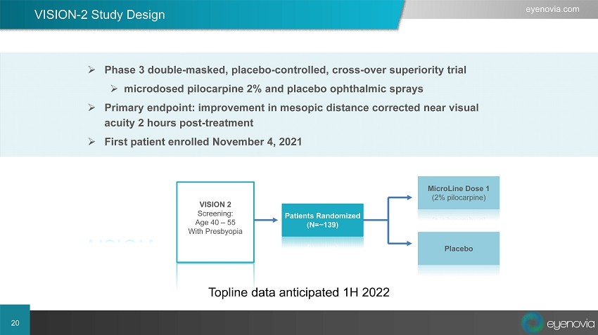 eyenovia.com 20 VISION - 2 Study Design VISION 2 Screening: Age 40 – 55 With Presbyopia Patients Randomized (N=~139) MicroLine Dose 1 (2% pilocarpine) Placebo Topline data anticipated 1H 2022 » Phase 3 double - masked, placebo - controlled, cross - over superiority trial » microdosed pilocarpine 2% and placebo ophthalmic sprays » Primary endpoint: improvement in mesopic distance corrected near visual acuity 2 hours post - treatment » First patient enrolled November 4, 2021