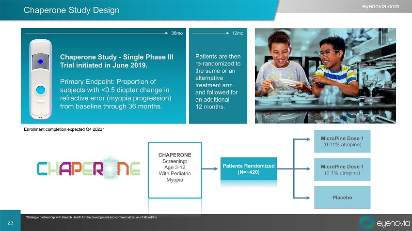 eyenovia.com 23 Chaperone Study Design CHAPERONE Screening: Age 3 - 12 With Pediatric Myopia Patients Randomized (N=~420) MicroPine Dose 1 (0.1% atropine) Placebo MicroPine Dose 1 (0.01% atropine) 36mo 12mo *Strategic partnership with Bausch Health for the development and commercialization of MicroPine Enrollment completion expected Q4 2022* Chaperone Study - Single Phase III Trial initiated in June 2019. Primary Endpoint: Proportion of subjects with <0.5 diopter change in refractive error (myopia progression) from baseline through 36 months. Patients are then re - randomized to the same or an alternative treatment arm and followed for an additional 12 months.